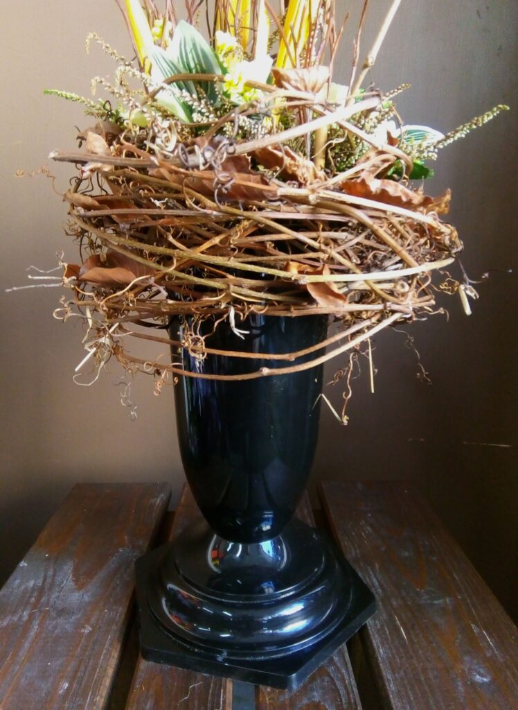 Zátěžová, plastová váza s vřesem a hnízdem z psího vína. Výška 55 cm, šířka 22 cm.